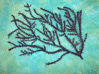 'The Deep Blue Sea' by Kathrina Hughes has been machine embroidered using metallic threads on to hand dyed and printed cotton.