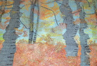 'Autumn Gold' by Dee Kelly was inspired by the glowing colours of autumn. It was created by layering fabric, paper, bondaweb, chiffon and hand stitch.