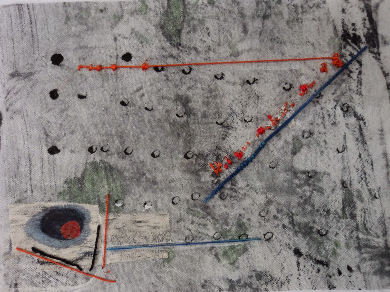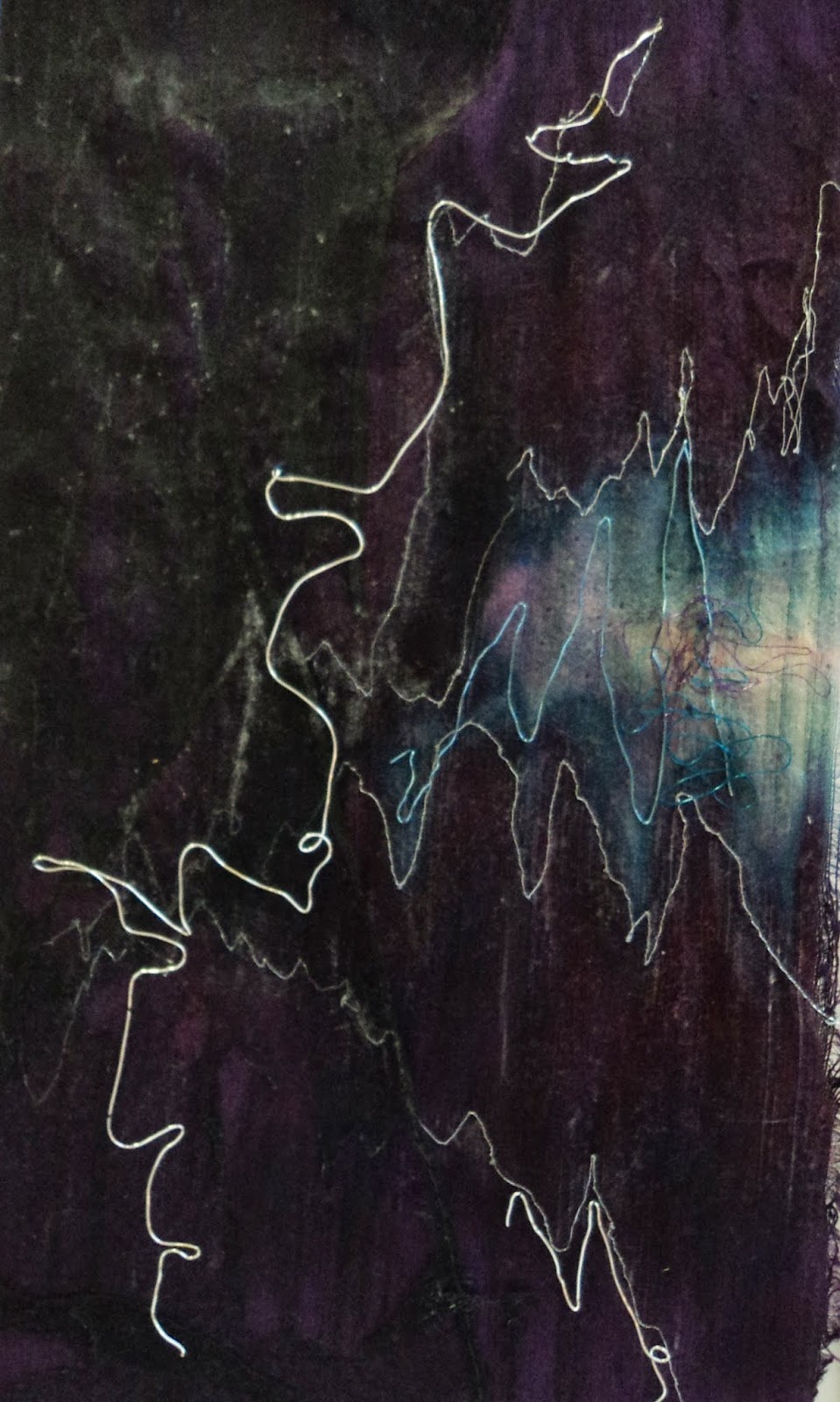 A close up of 'Astral Storm' by Colleen Prendiville - applique and hand stitch on mono printed cotton.