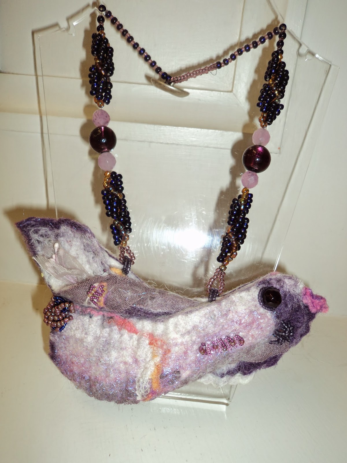 'In Flight' by Elaine Peden is a hand felted necklace consisting of up-cycled fabric, mixed fibres, Japanese seed beads, faceted stones and antique buttons.